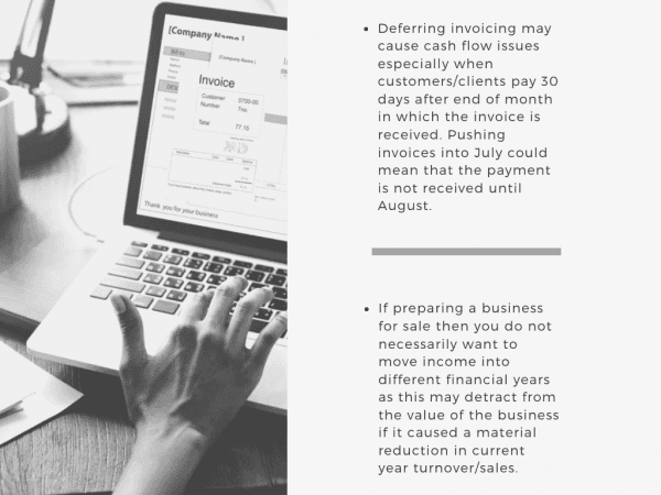 You may want to consider whether to defer the invoicing of work until after 30 June. While it may push income into the next tax year you also need to assess the commercial aspects which include: