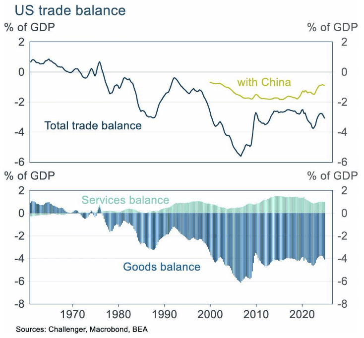 President Trump's tariff obsession is rooted in a dislike of trade deficits. The United States has run a trade deficit since the mid-1970s. He attributes this deficit to unfair trade policies in other countries and an overvalued US dollar, resulting from US dollar demand given its role in international trade and finance. But the trade deficit also depends on US domestic conditions, notably the US Government's huge fiscal deficit, currently 5% of GDP.